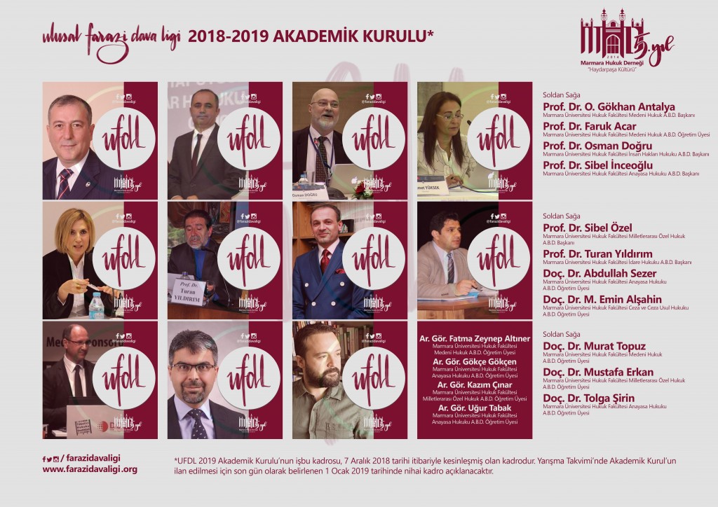 Ulusal Farazi Dava Ligi Akademik Kurulu, kesinleşmiş ilk halini almıştır. Kurul’un nihai kadrosu, 1 Ocak 2019 tarihinde farazi olay metinleri ile birlikte açıklanacaktır. Akademik Kurul’un oluşturulması için gerçekleştirilen görüşme ve istişareler neticesinde Yarışma Takvimi’nde de bir değişiklik öngörülmüştür. Buna göre ön başvuru için son tarih 1 Ocak 2019, kesin kayıt için son tarih 15 Ocak 2019 olarak belirlenmiş; bu doğrultuda Yarışma Rehberi güncellenmiştir.