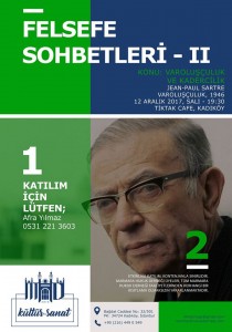 Etkinliğimizde, felsefe akımlarından Varoluşçuluk ve Kadercilik ele alınacaktır ve Varoluşçuluk akımının en önemli temsilcilerinden biri olan Jean Paul Sartre’ın hayatı ve düşünceleri değerlendirilecektir. Bu nedenle katılımcılarımızın Jean Paul Sartre’ın Varoluşçuluk kitabını okumaları tavsiye edilir. Yine bu akımların temsilcisi olan filozofların düşünceleri de tartışılacaktır.