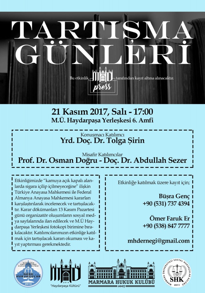 Fakülte Anayasa Hukuku Anabilim Dalı Öğretim Üyesi Yrd. Doç. Dr. Tolga Şirin’in konuşmacı katılımcı, İnsan Hakları Anabilim Dalı Başkanı Prof. Dr. Osman Doğru ile Anayasa Hukuku Anabilim Dalı Öğretim Üyesi Doç. Dr. Abdullah Sezer’in misafir katılımcı olarak yer alacağı Tartışma Günleri etkinliğimiz; 21 Kasım 2017, Salı günü saat 17:00’da Marmara Üniversitesi Haydarpaşa Yerleşkesi 6. Amfi’de!